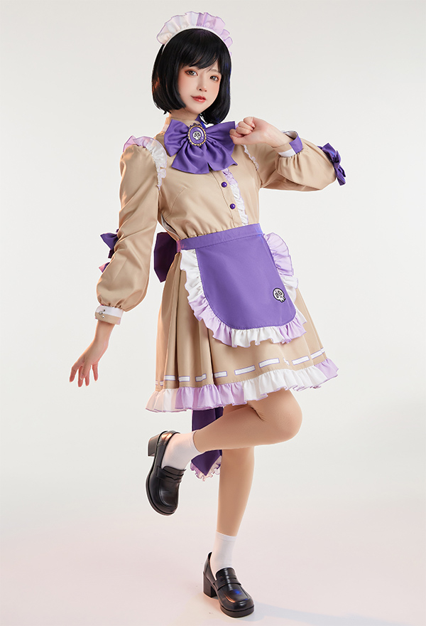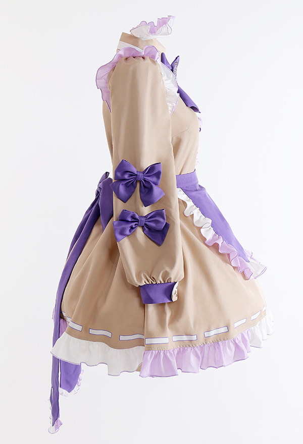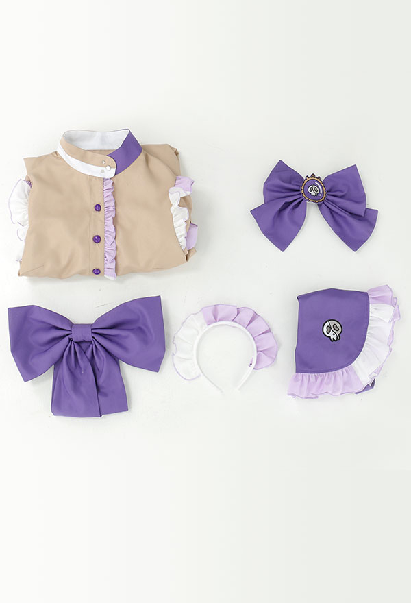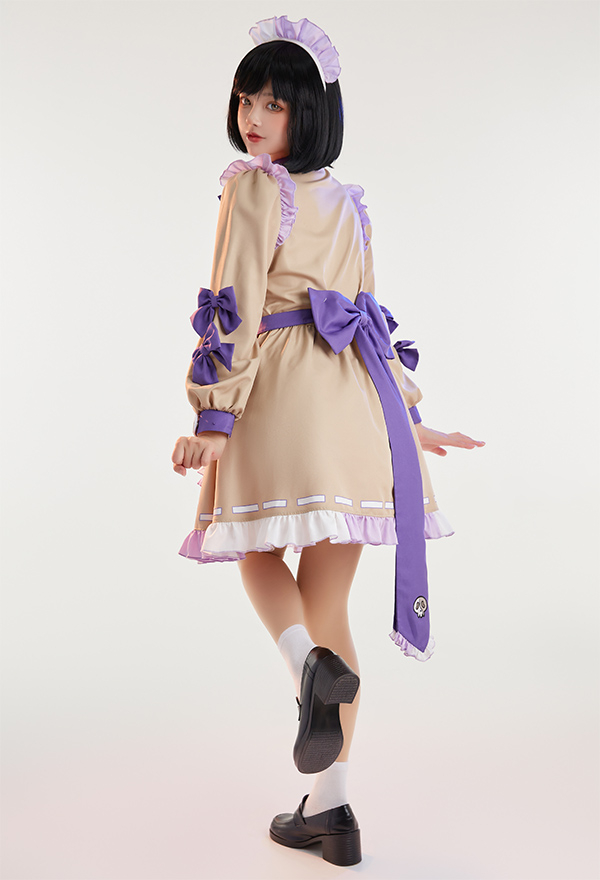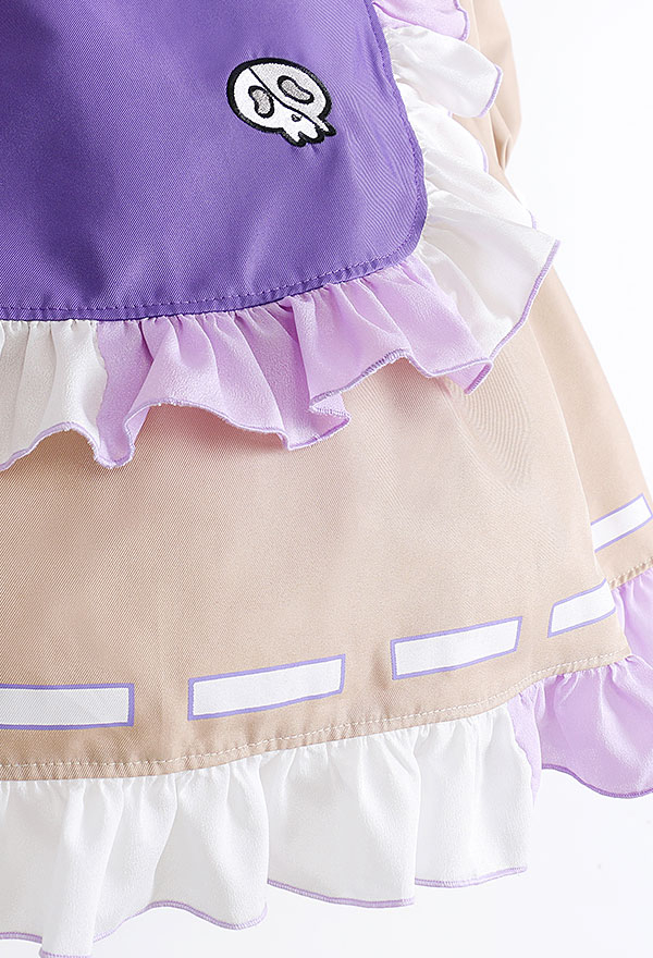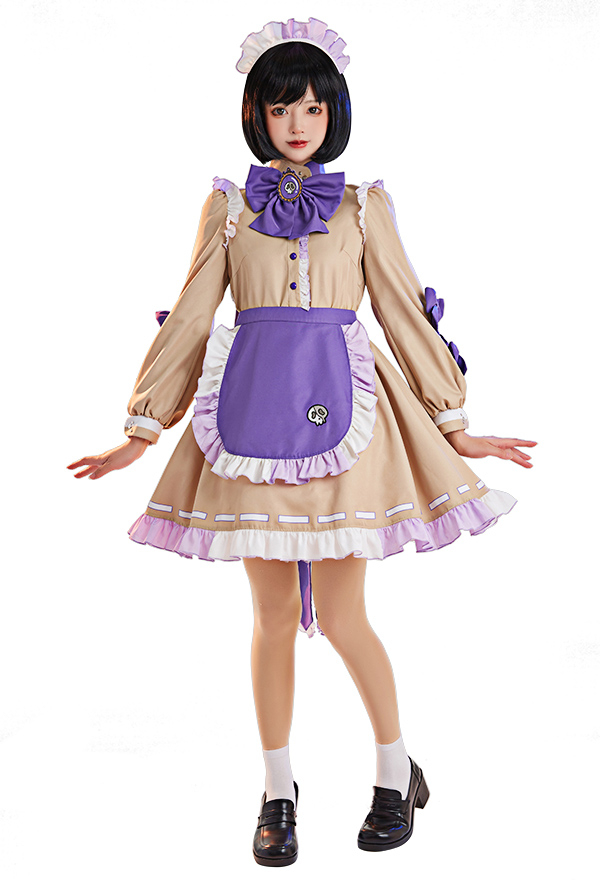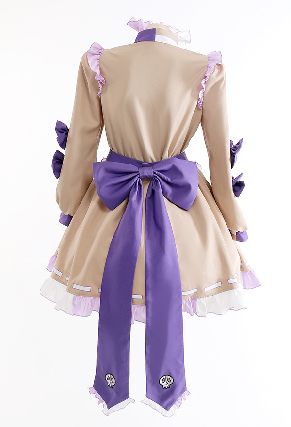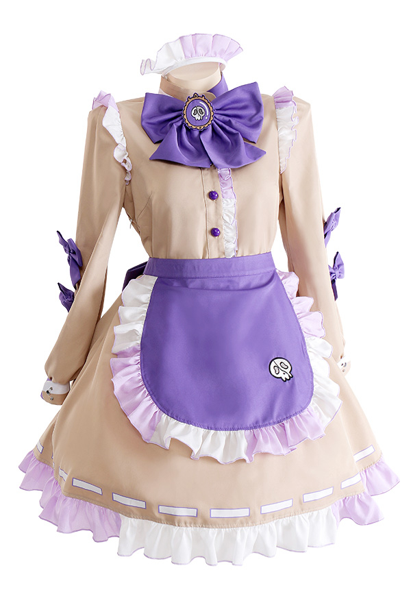 - This maid dress features khaki and purple match color, skull print, bowknot tie, and intricate ruffle details.