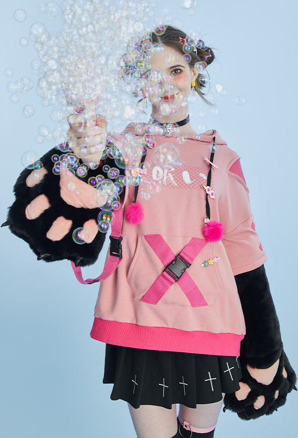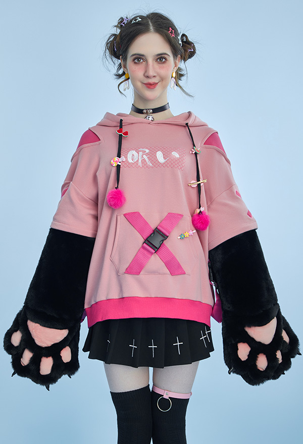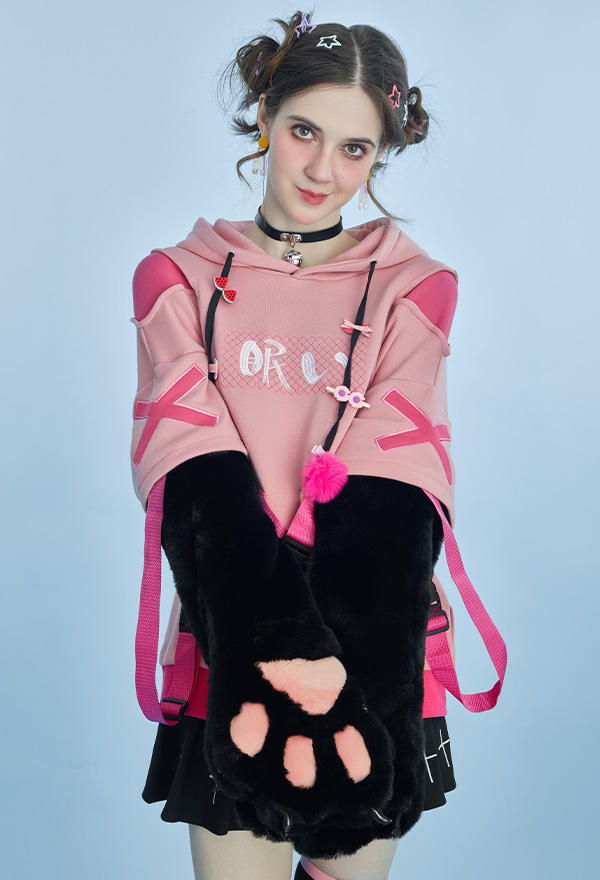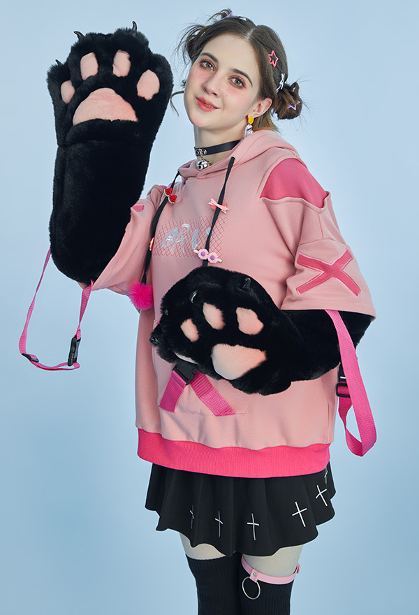 Dreaming Kitten Cat Pullover Furry Hoodie Cute Style Pastel Character Pattern Hoodie with Plush Cat Paw Gloves