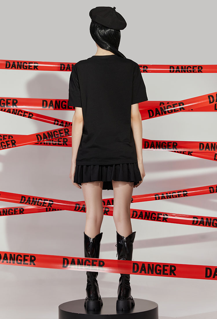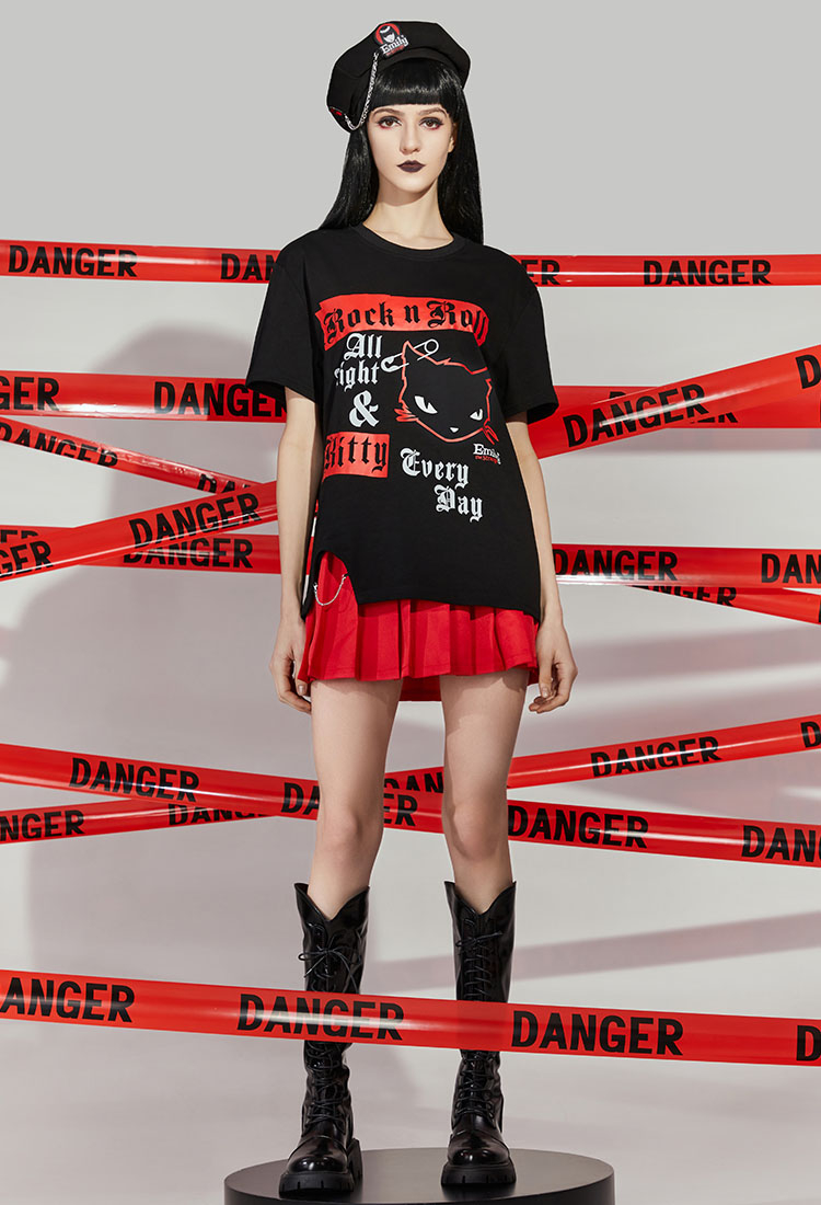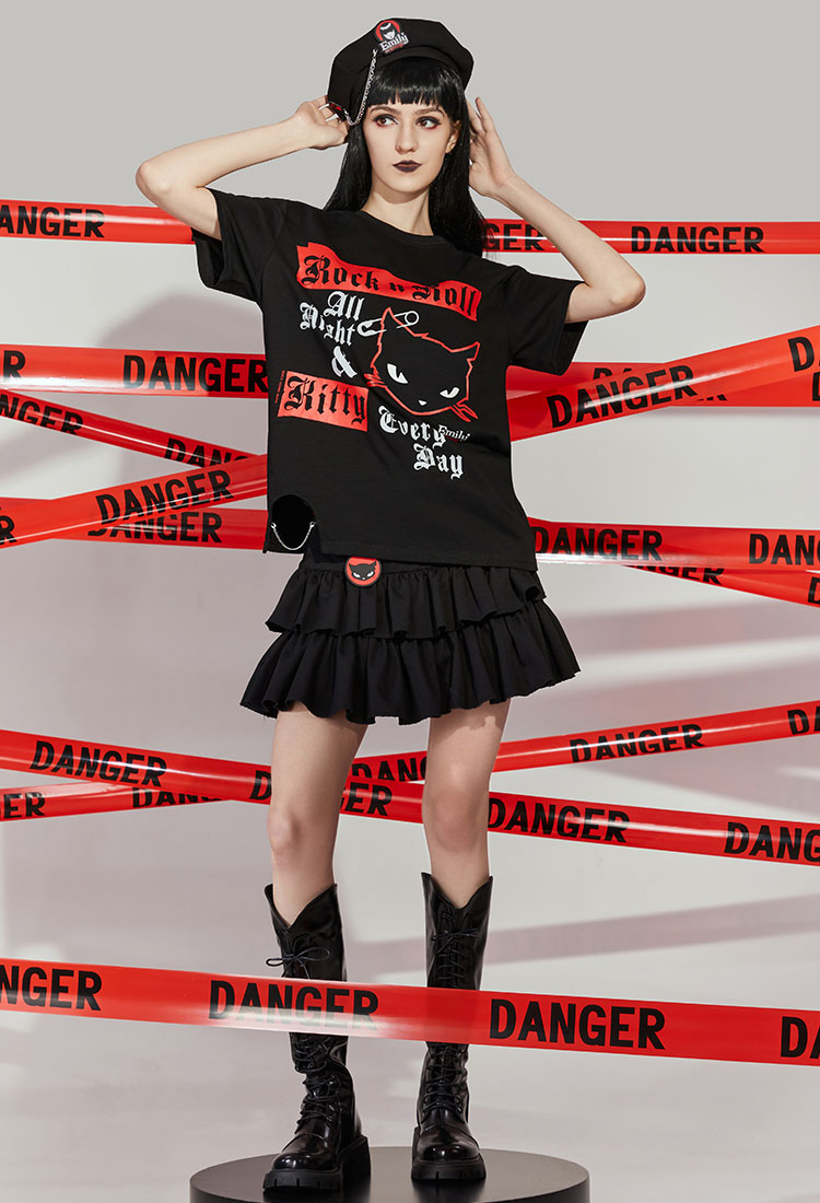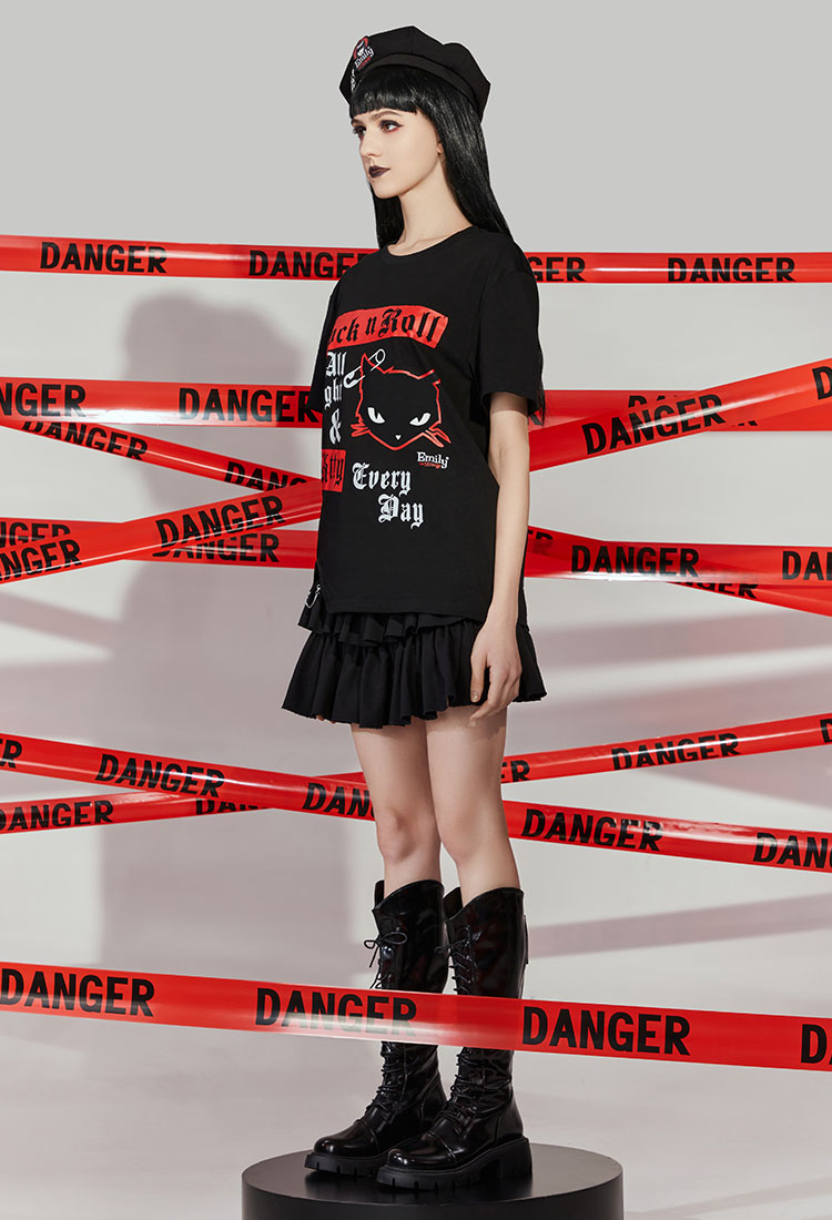 [Officially Licensed] Emily The Strange Micotaku All Night and Kitty Every Day Print Loose Fit Black T-Shirt Unisex