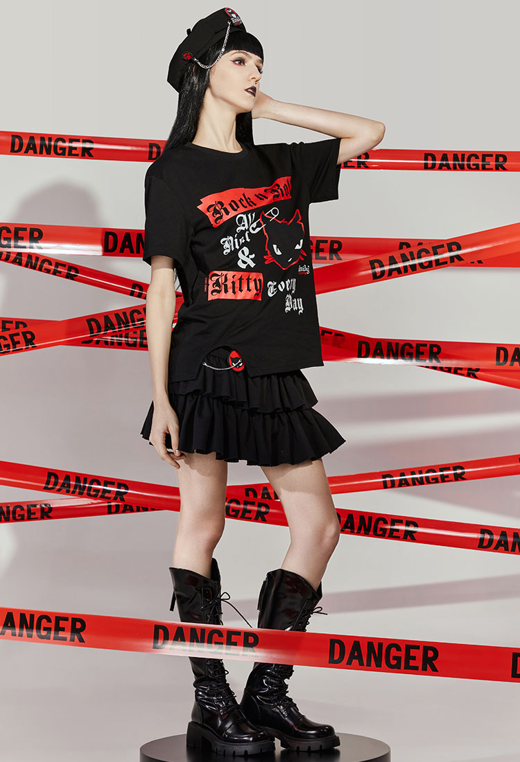 - Black relaxed fit unisex Emily the Strange T-shirt featuring All Night and Kitty Every Day print, cutout at hem, and metal chain attached at the bottom