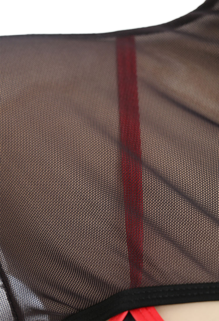 - The one-piece swimsuit features a rock n roll print, front lace-up straps, ruffled hem and sheer mesh shrug cover-up.