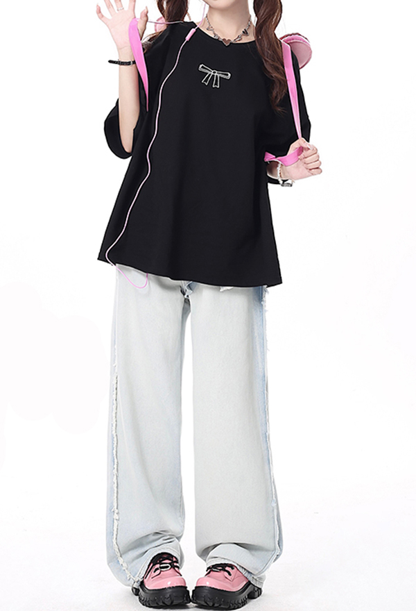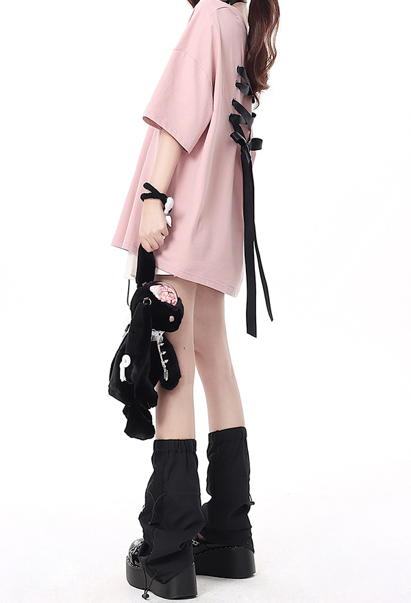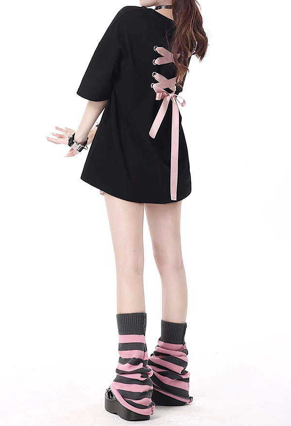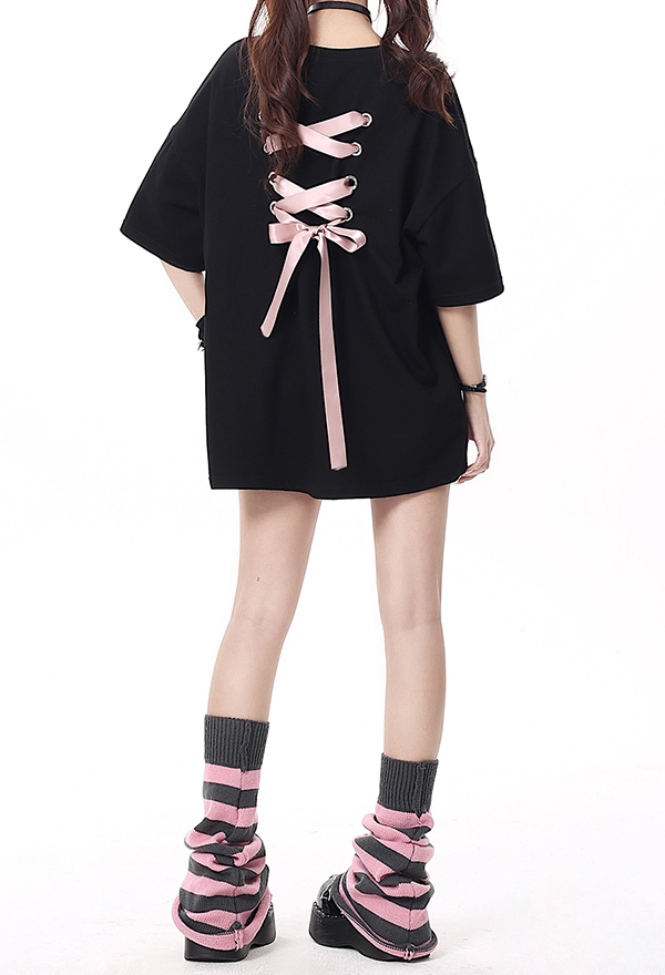 Heartbeat Code Women Y2K Style Bowknot Print Back Straps Short Sleeves Oversize T-shirt for Summer