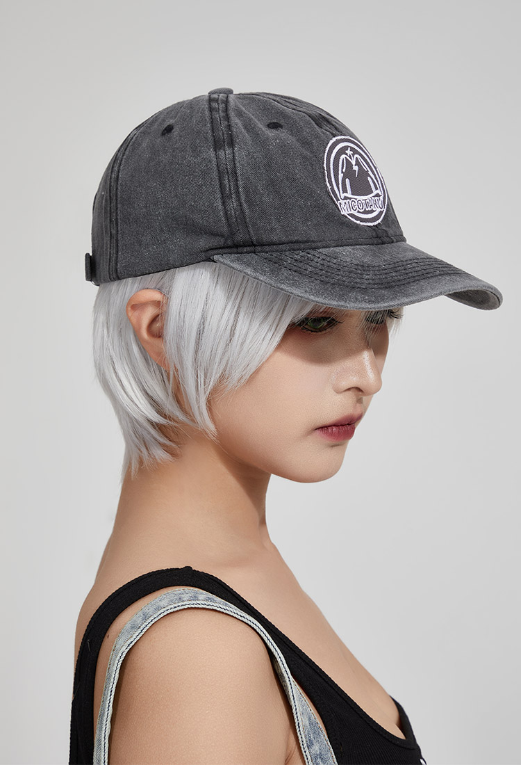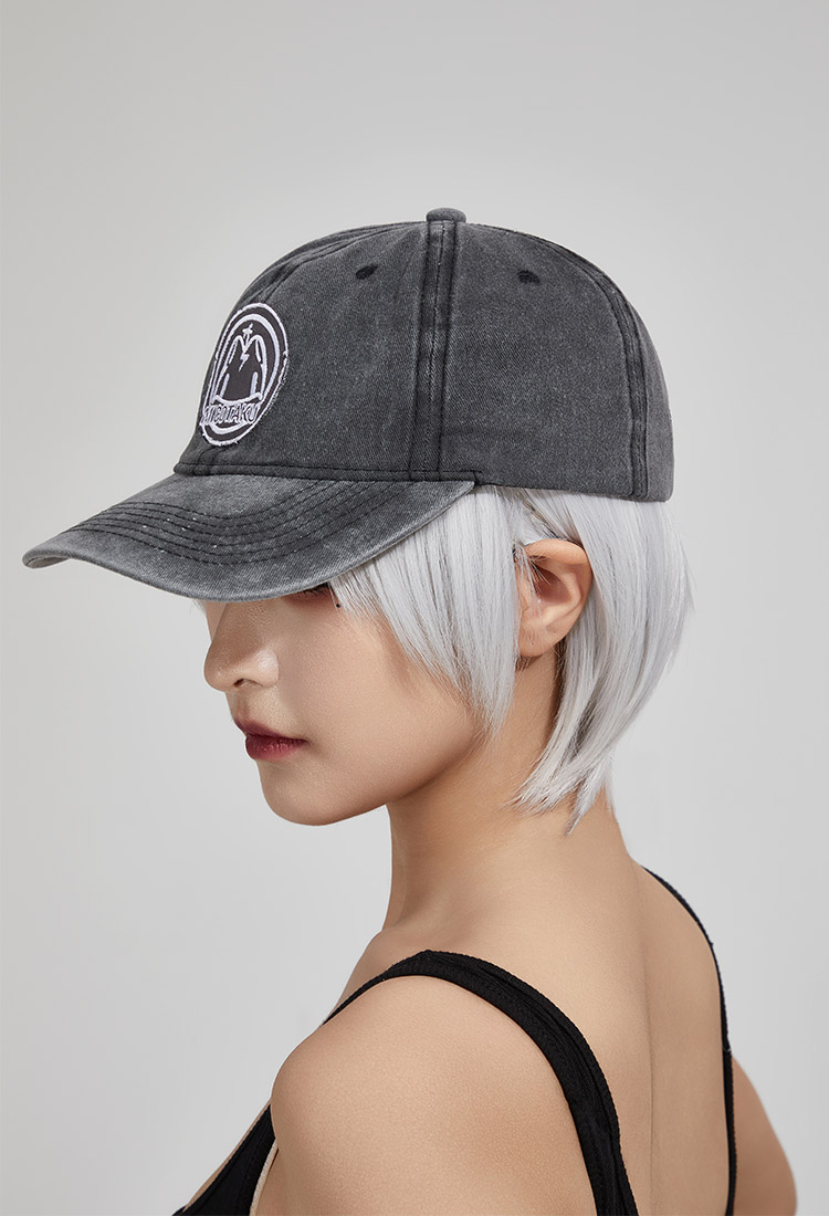 - Black washed denim baseball cap with graphic embroidered at front panel