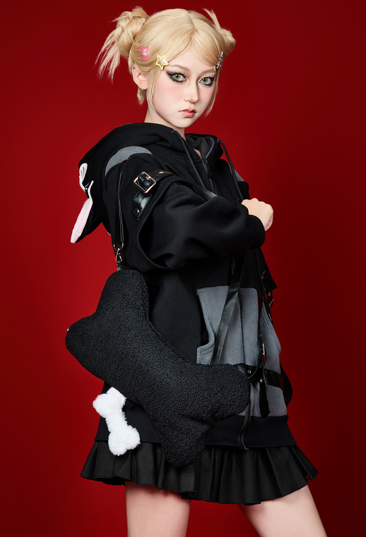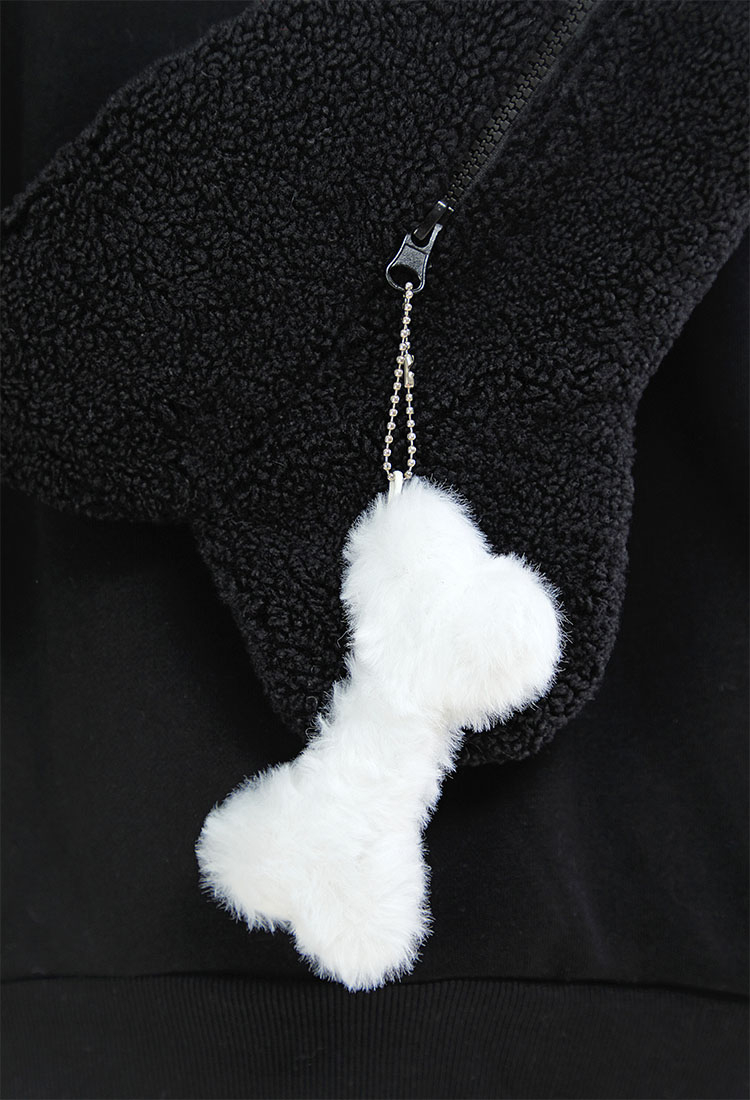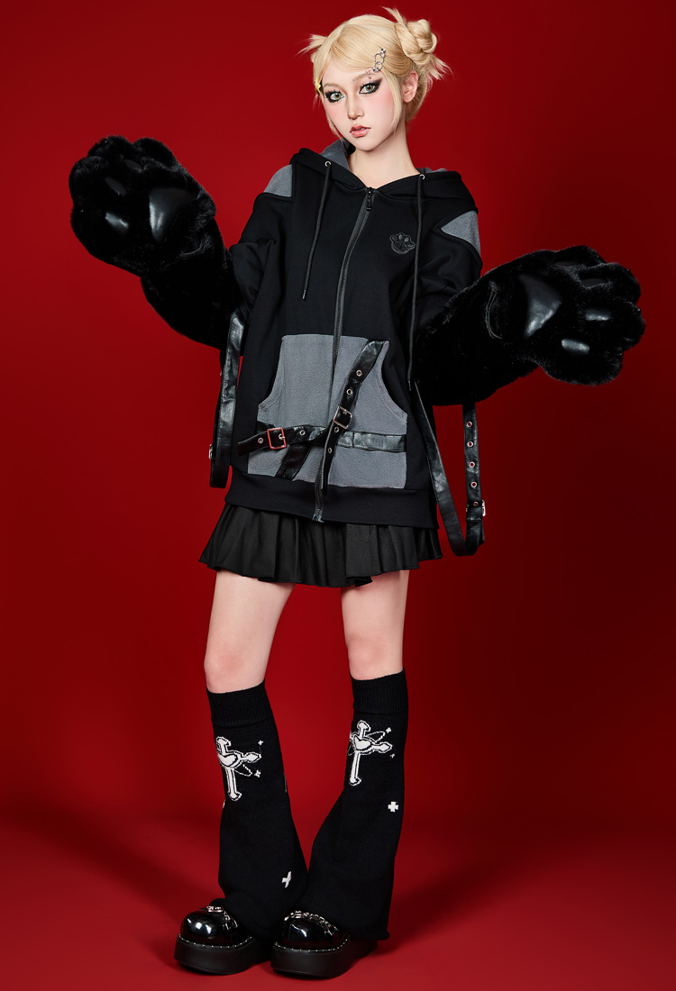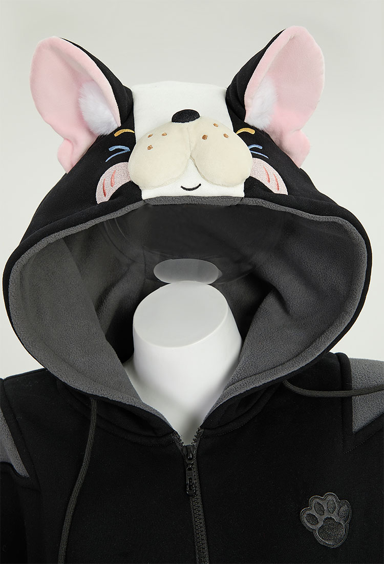 - Micotaku French Bulldog Black and Gray Paw Hoodie includes 2 detachable furry paws, 2 straps, a backpack and a decorative bone.