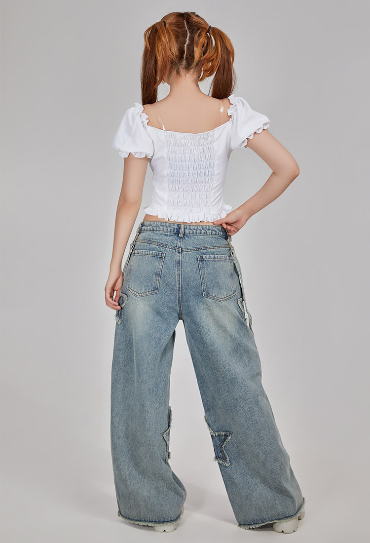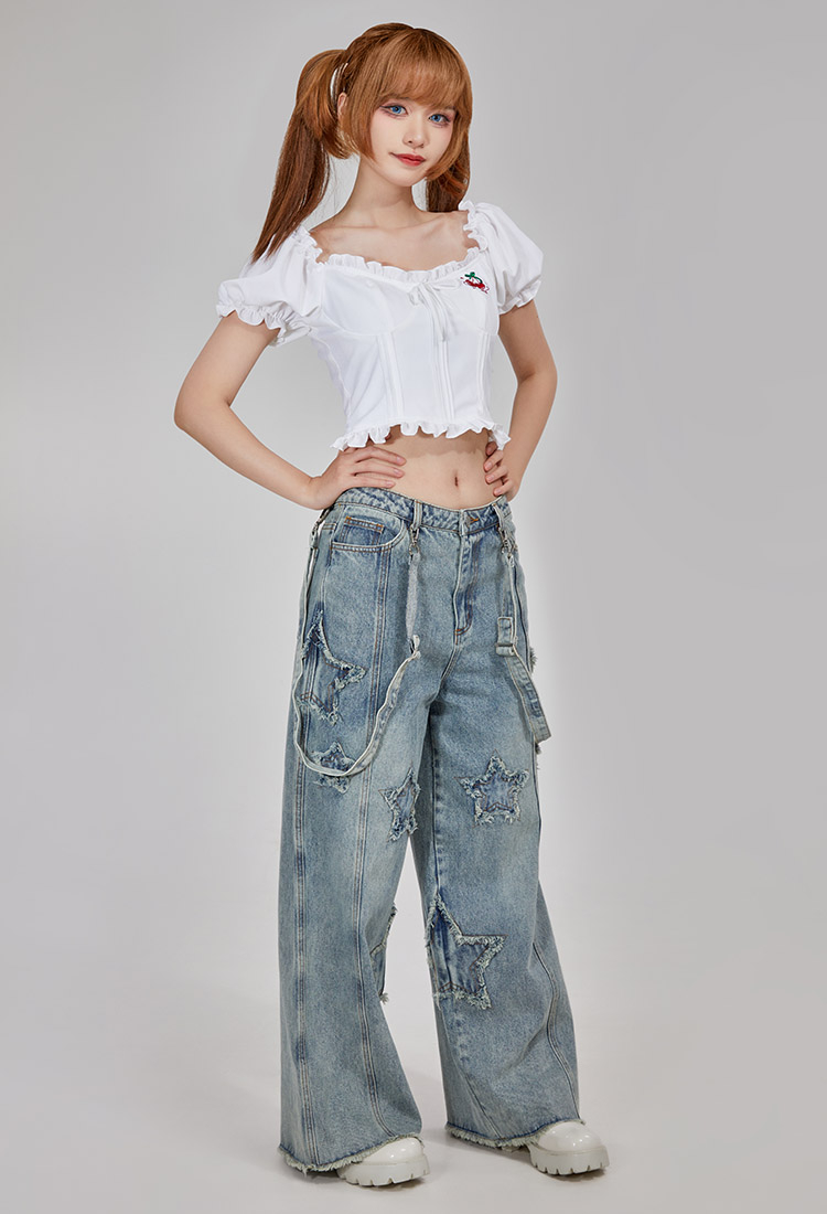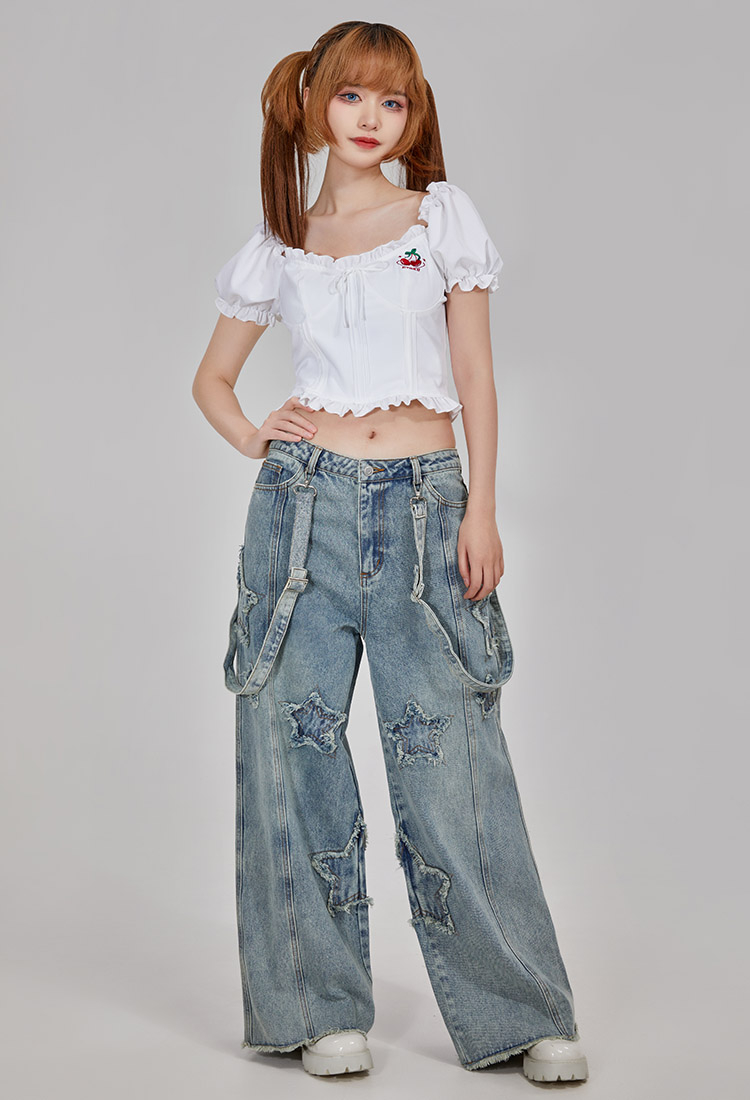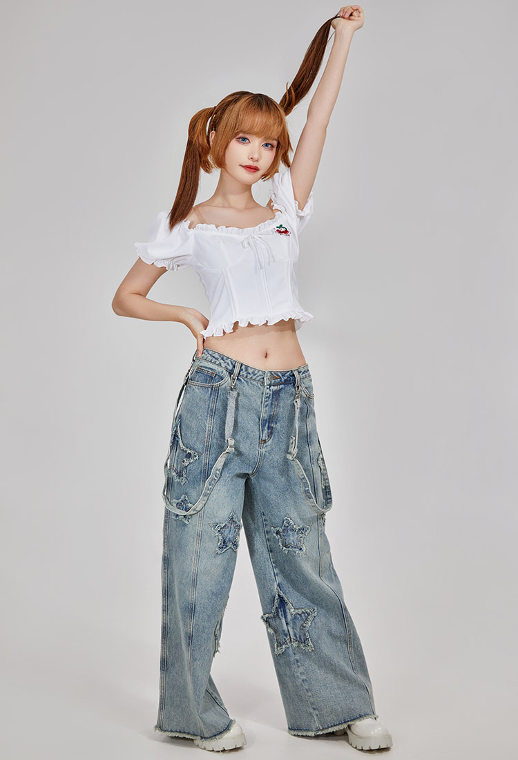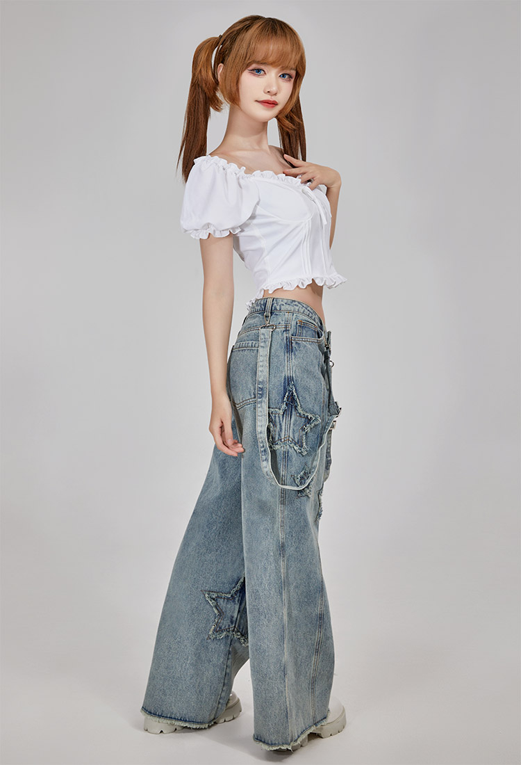 - Loose fit casual denim jeans featuring star print at front and detachable straps on sides