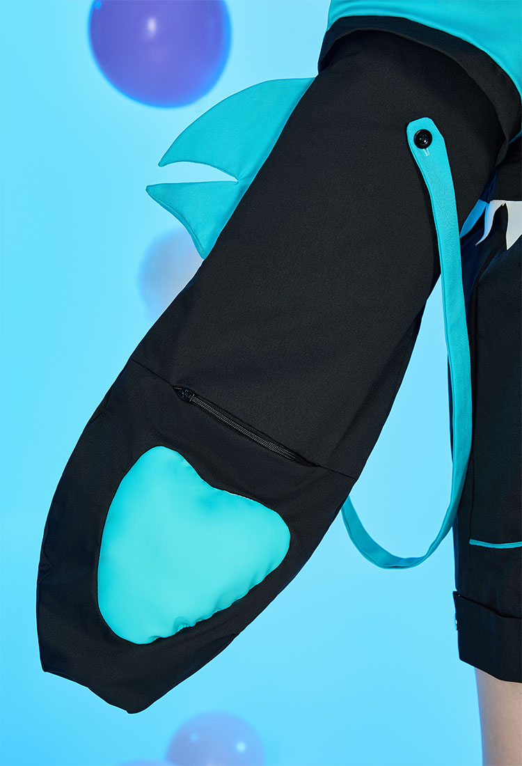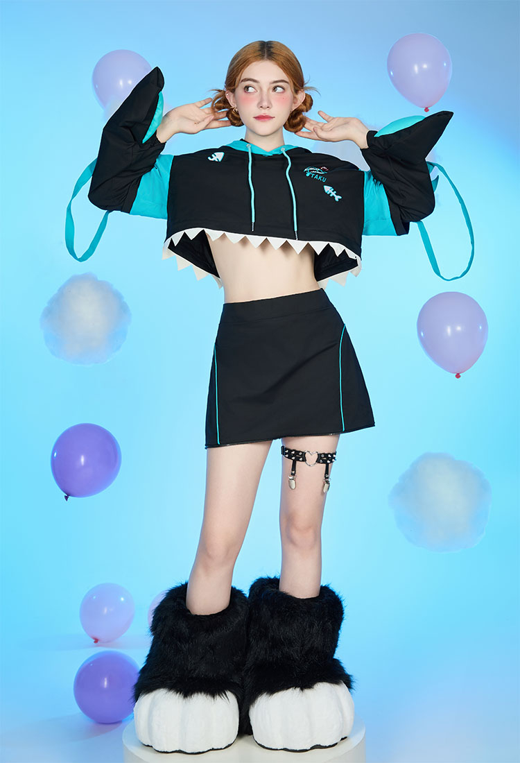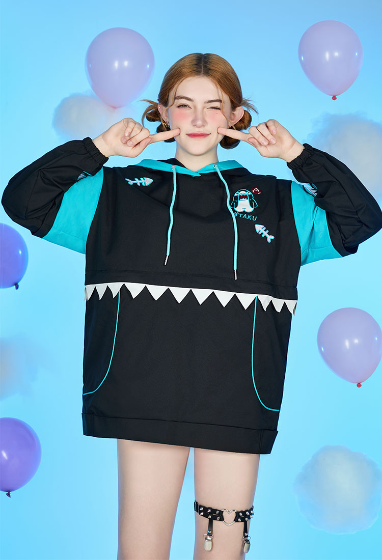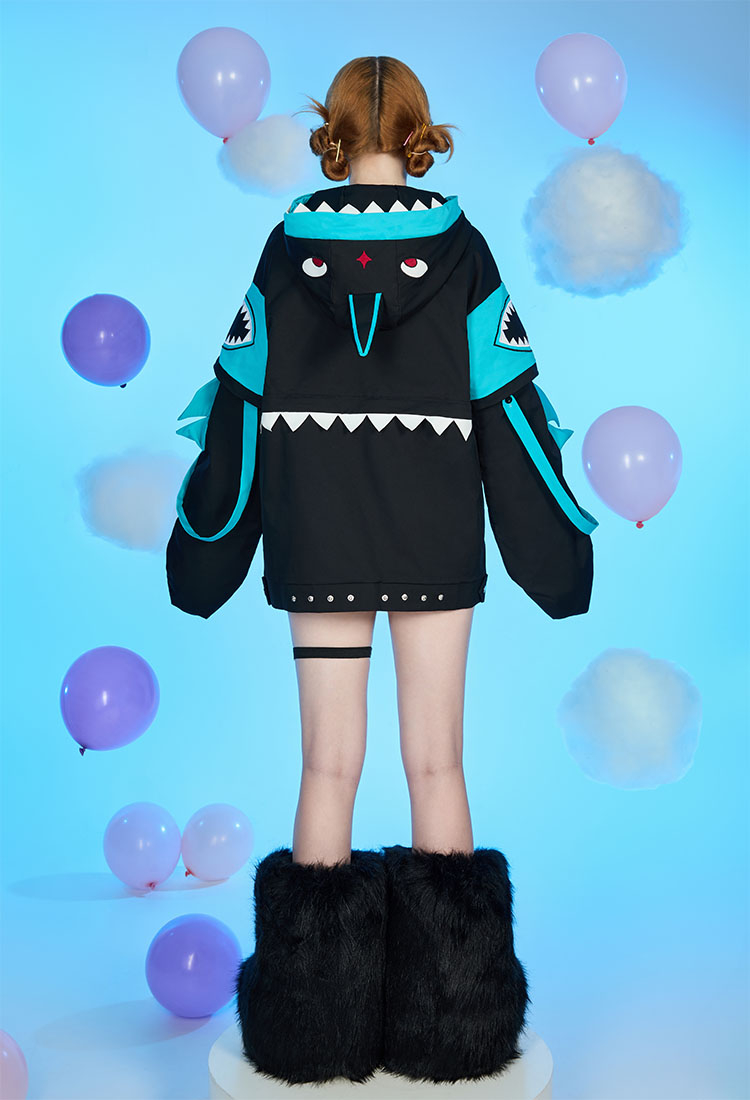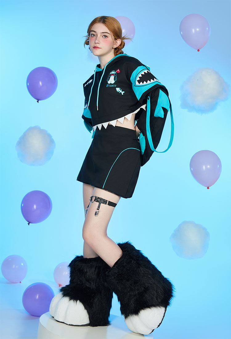 - Micotaku Black and Blue Shark Design Hoodie featuring detachable furry paws and skirt.