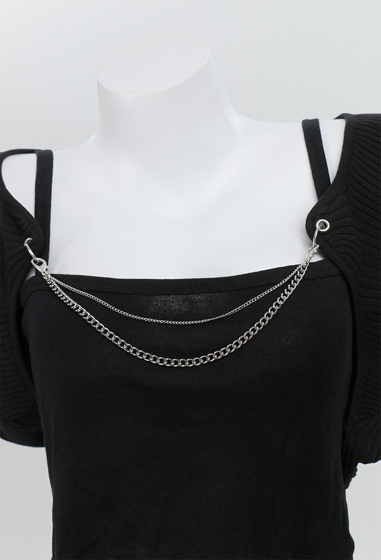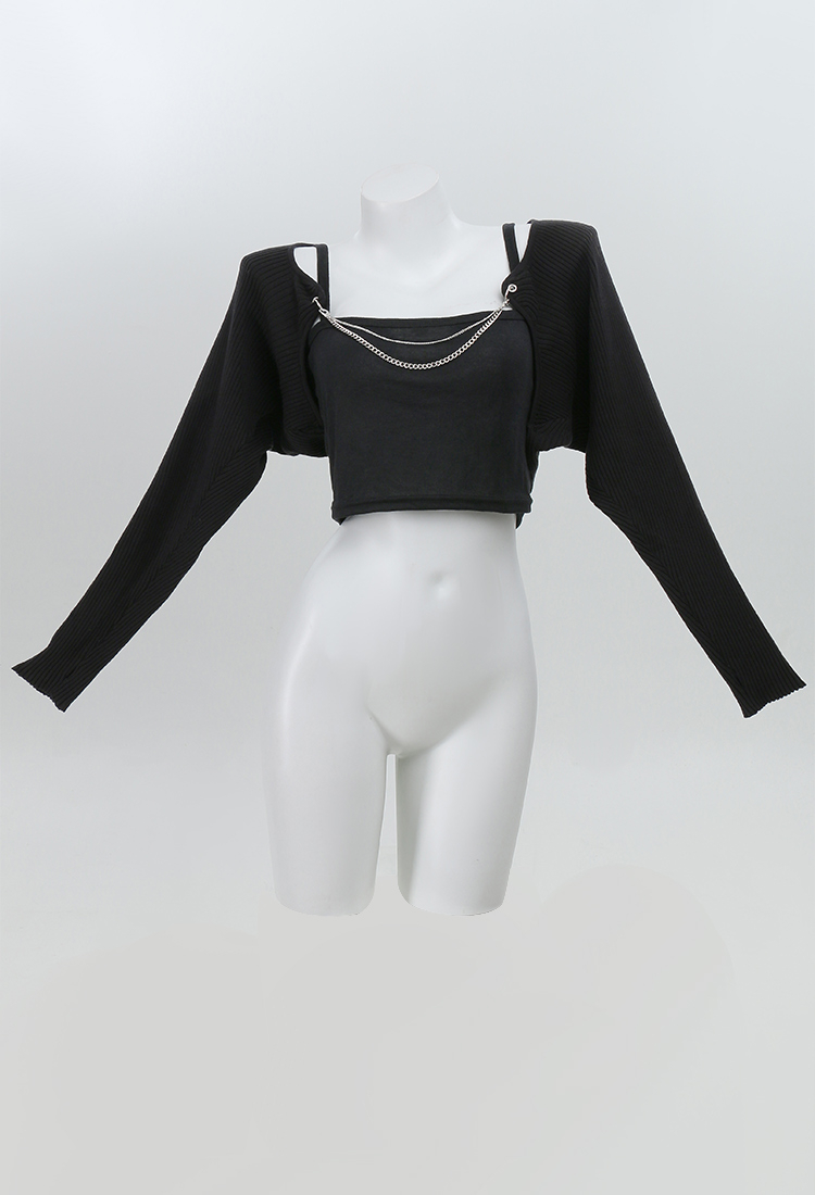 Micotaku Women Black Long Sleeve Crop Knit Cardigan with Chain