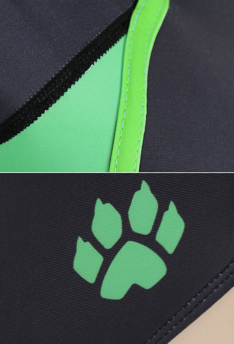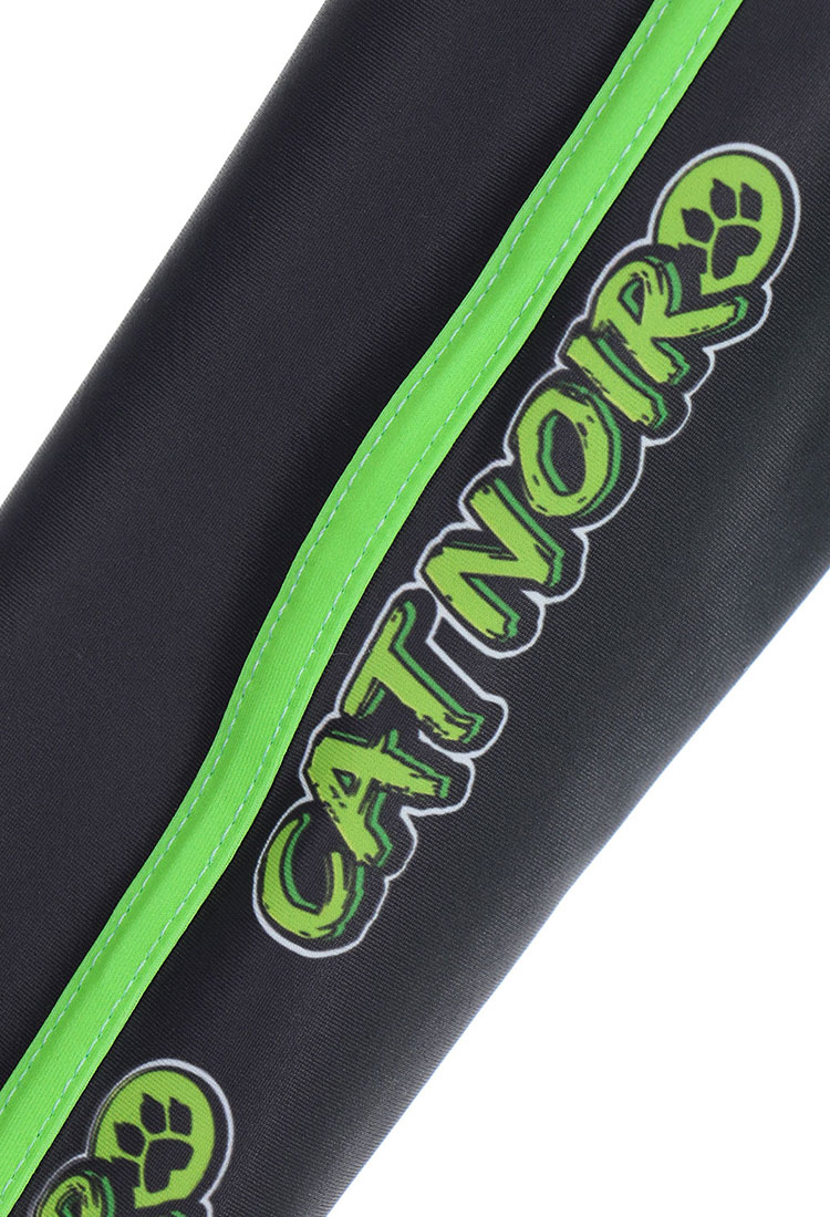 - Black and green long-sleeved one-piece swimsuit featuring cat Noir print at left shoulder and Cat paw print at left bottom
