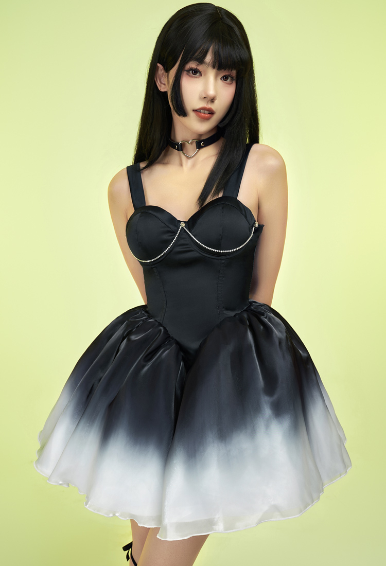 - This dress features a gradient hemline, with a detachable rhinestone embellishment at the chest. The bottom layer of the skirt is supported by two layers of stiff tulle, creating a built-in petticoat effect.