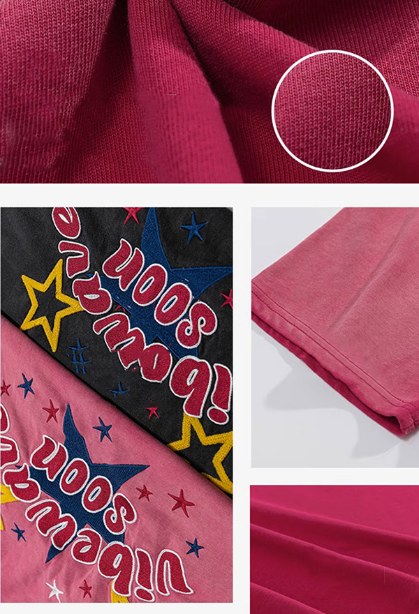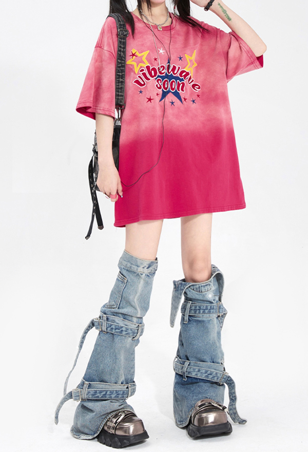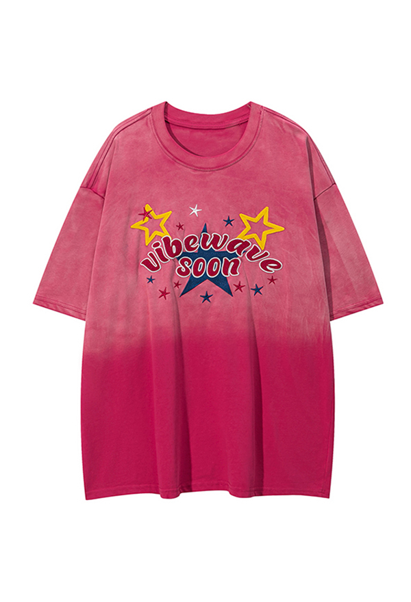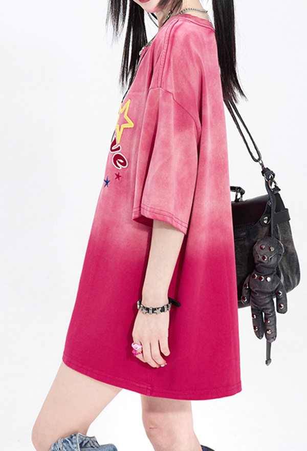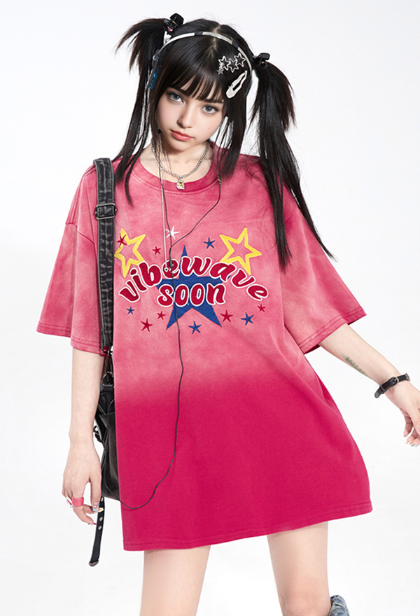 Starburst Women Y2K Style Pink Gradient Transition Color Star Embroidery Short Sleeves Oversize T-shirt for Summer