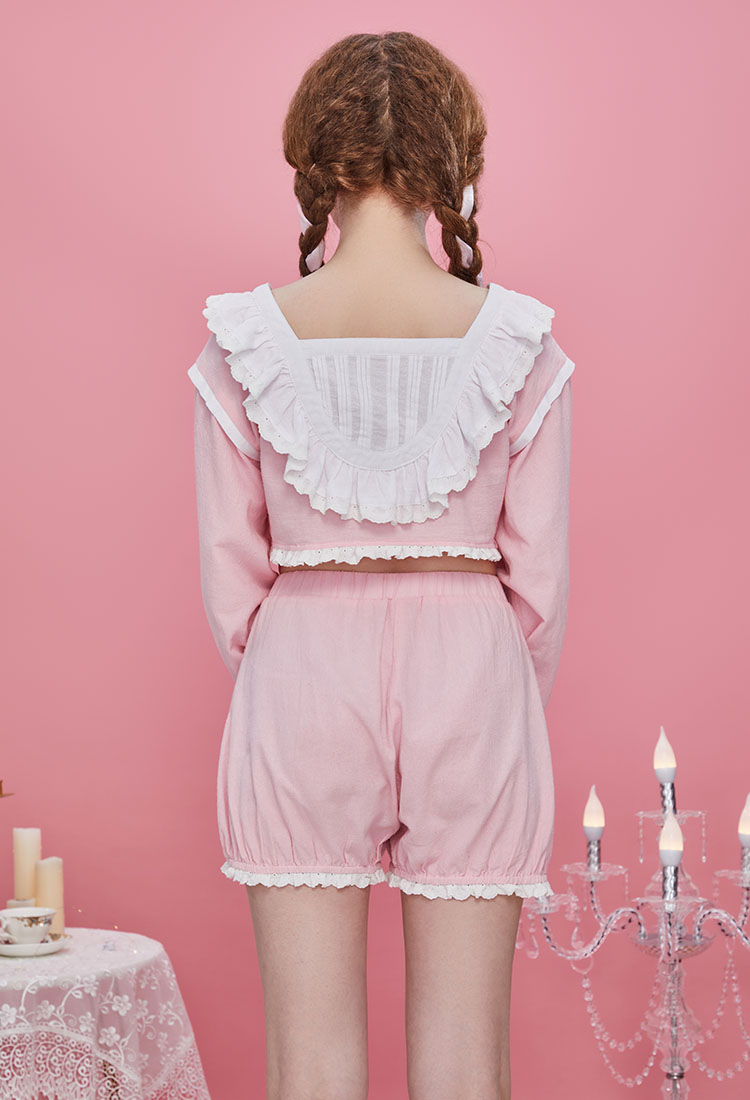 - This set includes a pink top and shorts combination that radiates sweetness and coziness, featuring a hint of bloomer-inspired design.