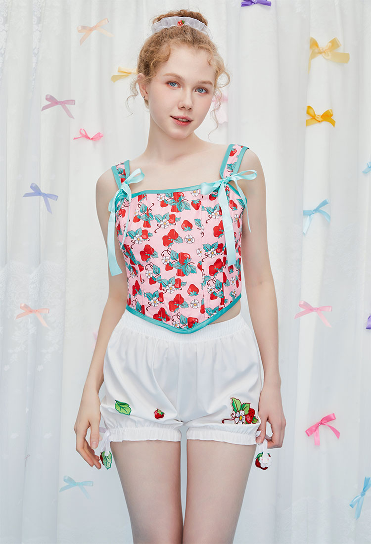- This corset top is designed to accentuate the curves of every woman, providing a flattering silhouette. Crafted with a unique vintage-inspired strawberry print, this top is all about embracing femininity