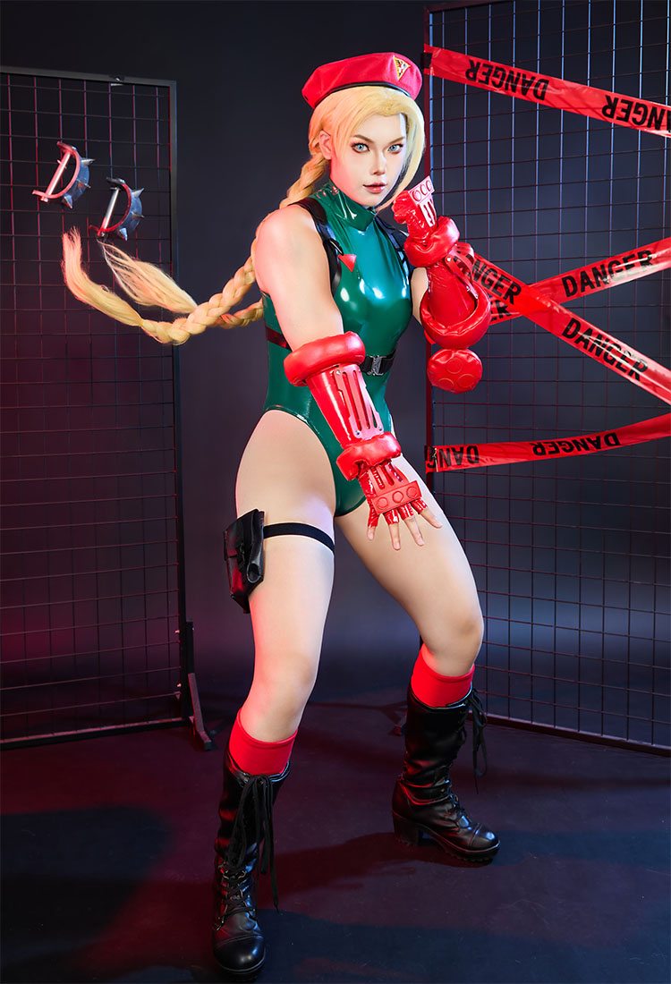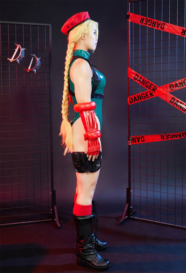 Transform into the fierce and iconic Cammy from Street Fighter with this Cosplay Costume! This full set includes a vibrant green bodysuit that perfectly captures Cammy's signature look.
