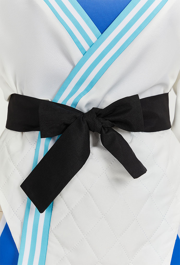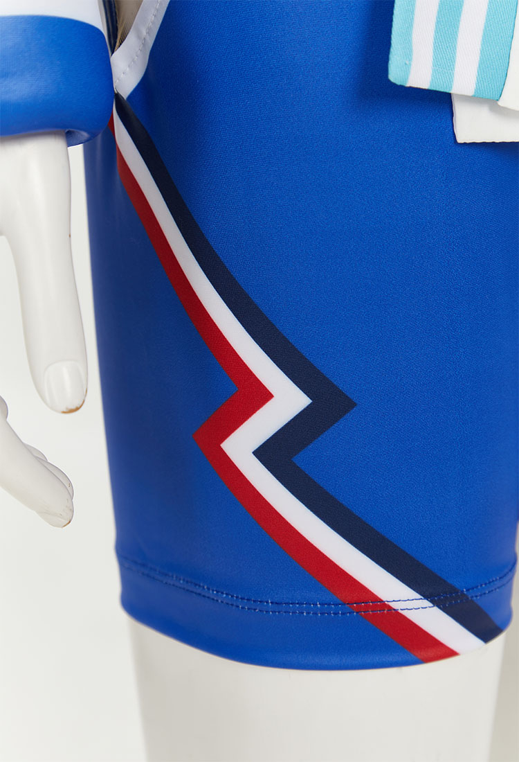 - The costume features a royal blue singlet adorned with red, white, and blue streaks, complete with stylish cutouts around the torso and hips for a modern and edgy look. Adding to the intricate details is a gold medal embedded on the collar, depicting two abstract figures engaged in a dynamic battle pose.