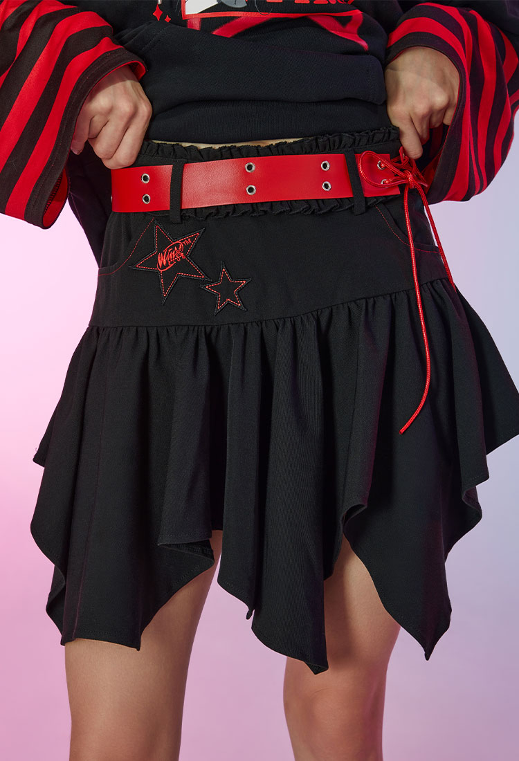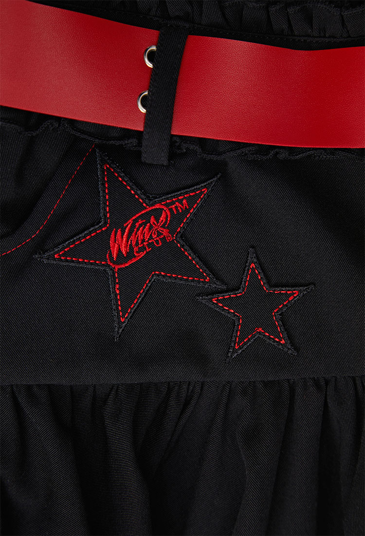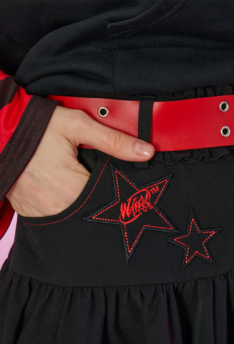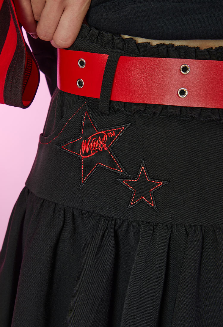 - Black skirt featuring uneven ruching at hem, two stars with Winx Club logo inside decorated at the left, and leather belt