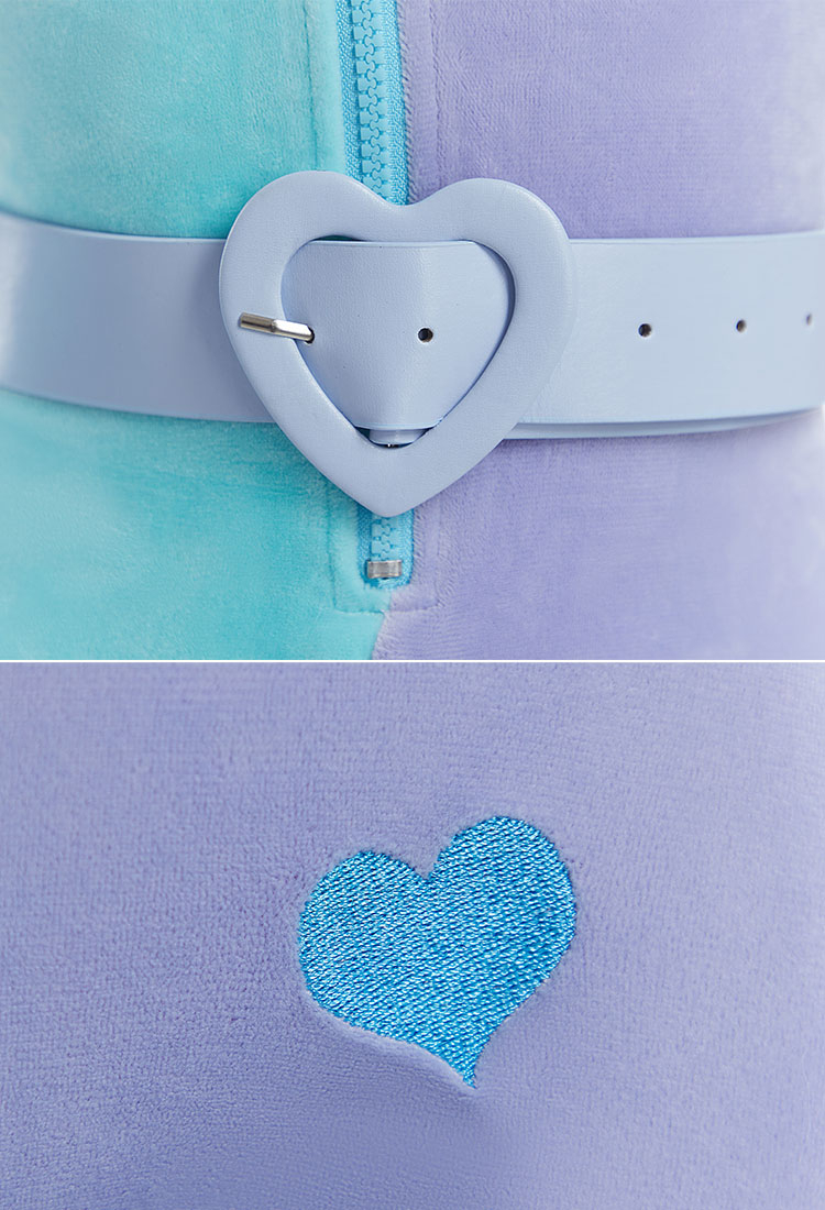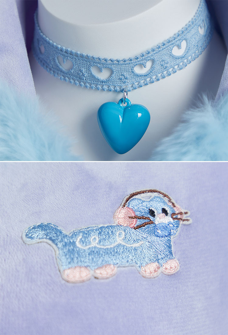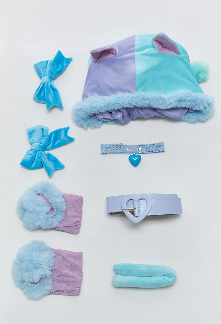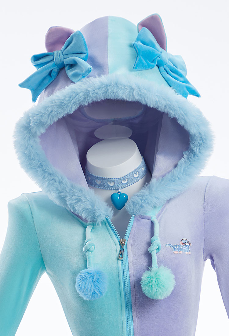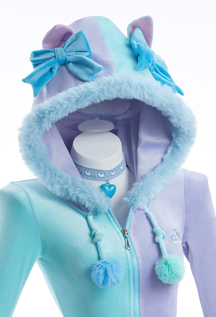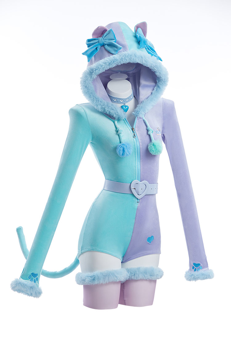 Step into soft pastel sweetness with this adorable macaron-inspired plush jumpsuit. Designed in a dreamy blue-and-lavender colorblock, it features a cozy hood with cat ears, oversized bows, fluffy pom-pom drawstrings, and a detachable heart-shaped belt for added charm. The fuzzy trim at the hood, sleeves, and shorts adds extra warmth and texture, while the matching cat tail and embroidered details complete the cute and playful look. Perfect for lounging, photoshoots, themed parties, or cozy days at home, this jumpsuit is the ultimate mix of softness, comfort, and irresistibly kawaii style.