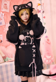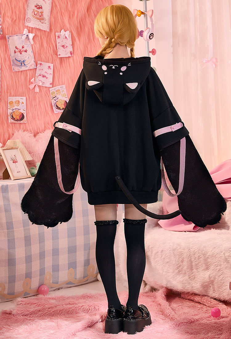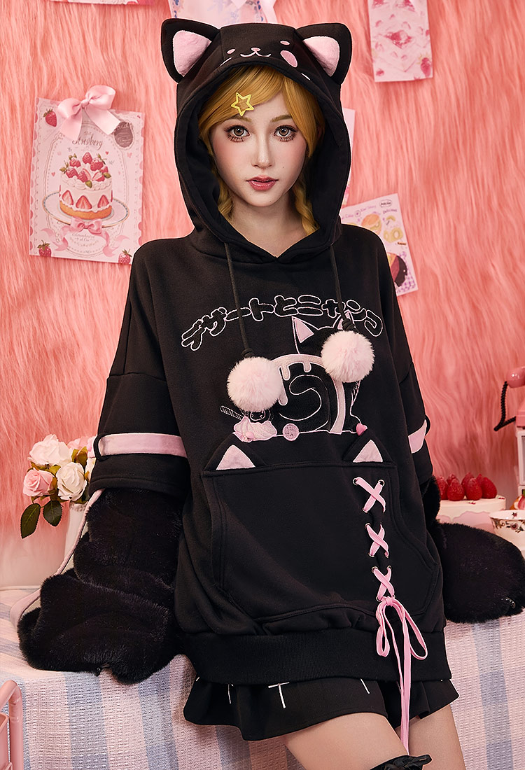 Inspired by the playful charm of a dessert cat, this adorable hoodie blends cozy comfort with kawaii style. Micotaku Sweet Dessert Cat Hoodie with Cat Ears and Furry Paws crafted from soft sweatshirt fabric, it features embroidered dessert-cat artwork, fluffy detachable paw gloves, ribbon lace-up details, and cat-ear hood with pom-poms. Perfect for daily wear, cosplay, or casual outings.