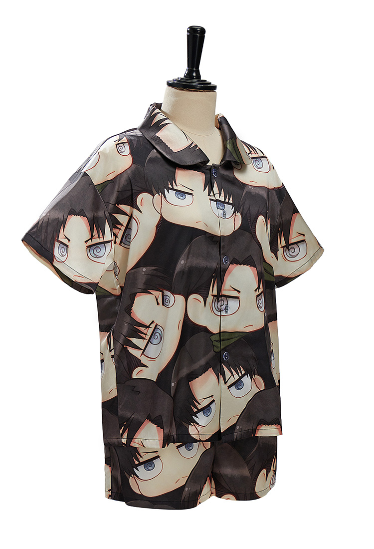 Sleep in Survey Corps style with this officially licensed Attack on Titan Levi Ackerman pajama set. Made from soft polyester for a smooth and lightweight feel, the set includes a short-sleeve button-up shirt and matching shorts. Featuring an all-over chibi Levi face print, this eye-catching design is perfect for lounging, sleeping, or showing your love for humanity’s strongest soldier.