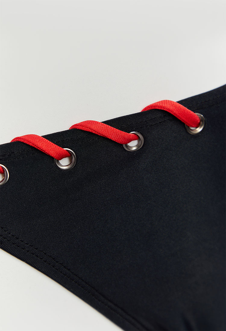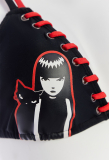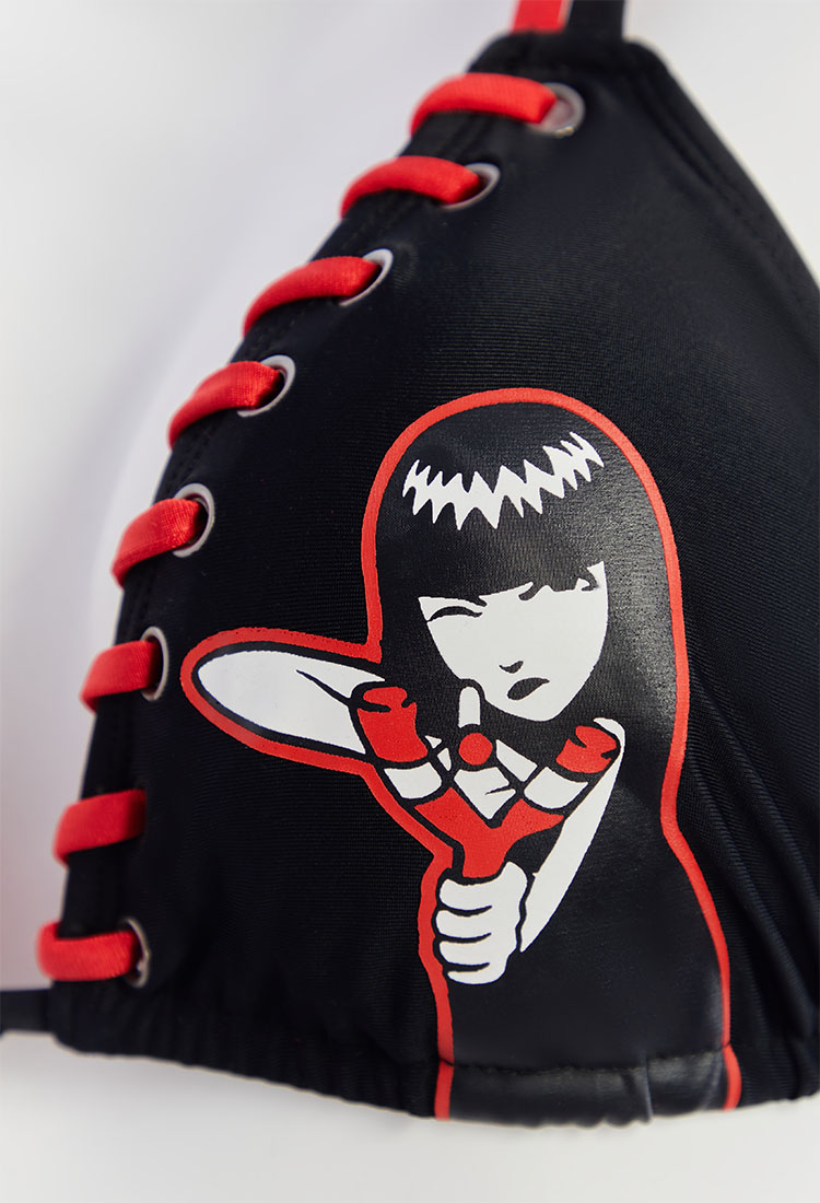 Embrace your dark side with this officially licensed Emily the Strange bikini set! Perfect for fans of the iconic gothic punk character, this two-piece features a bold black base with striking red accents. The triangle top showcases Emily’s signature graphic and includes a lace-up front for a customizable fit, while the matching string bikini bottoms offer a cheeky cut with adjustable side ties. The crisscross waistband adds an edgy, strappy detail that complements the overall punk aesthetic. Made from durable, stretchy swimwear fabric, this set is designed for comfort and style whether you’re hitting the beach, pool, or just rocking a unique look. Let Emily’s mysterious charm make a statement this summer