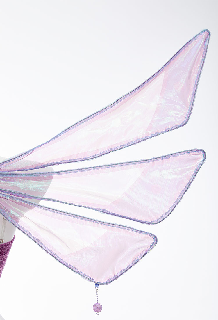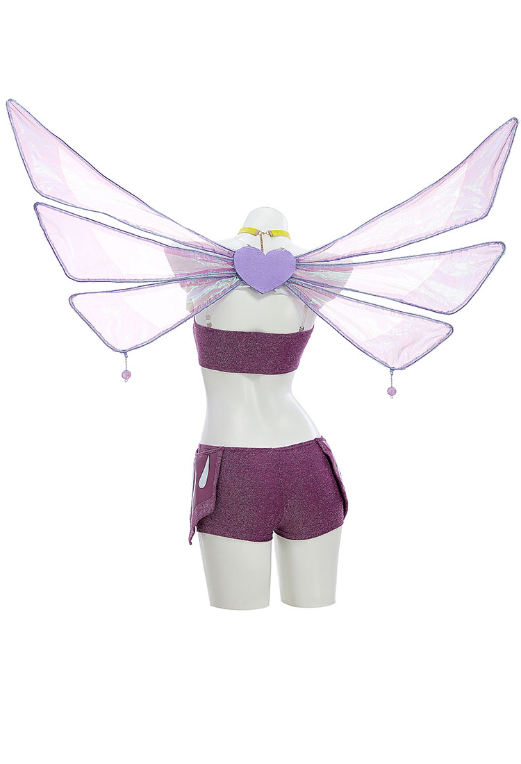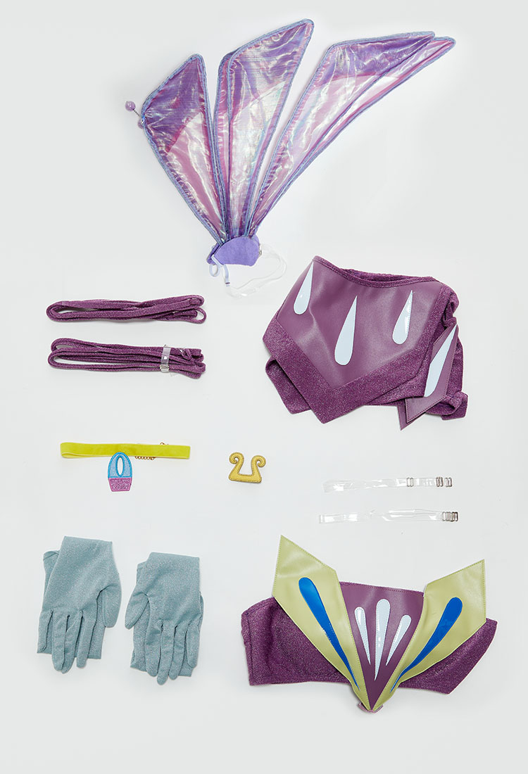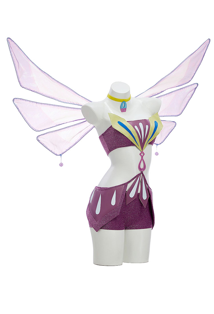Step into the world of technology and magic with this Enchantix Tecna cosplay costume! Designed with stretch glitter fabric combined with leather panels, the top and skirt are connected with hook fastenings. Matte purple leather is contrasted with reflective blue leather, restoring Tecna’s futuristic and elegant Enchantix look. The set includes gloves, pants, foot accessories, choker, headpiece, adjustable shoulder straps, and wings—perfect for conventions, cosplay performances, or collections.