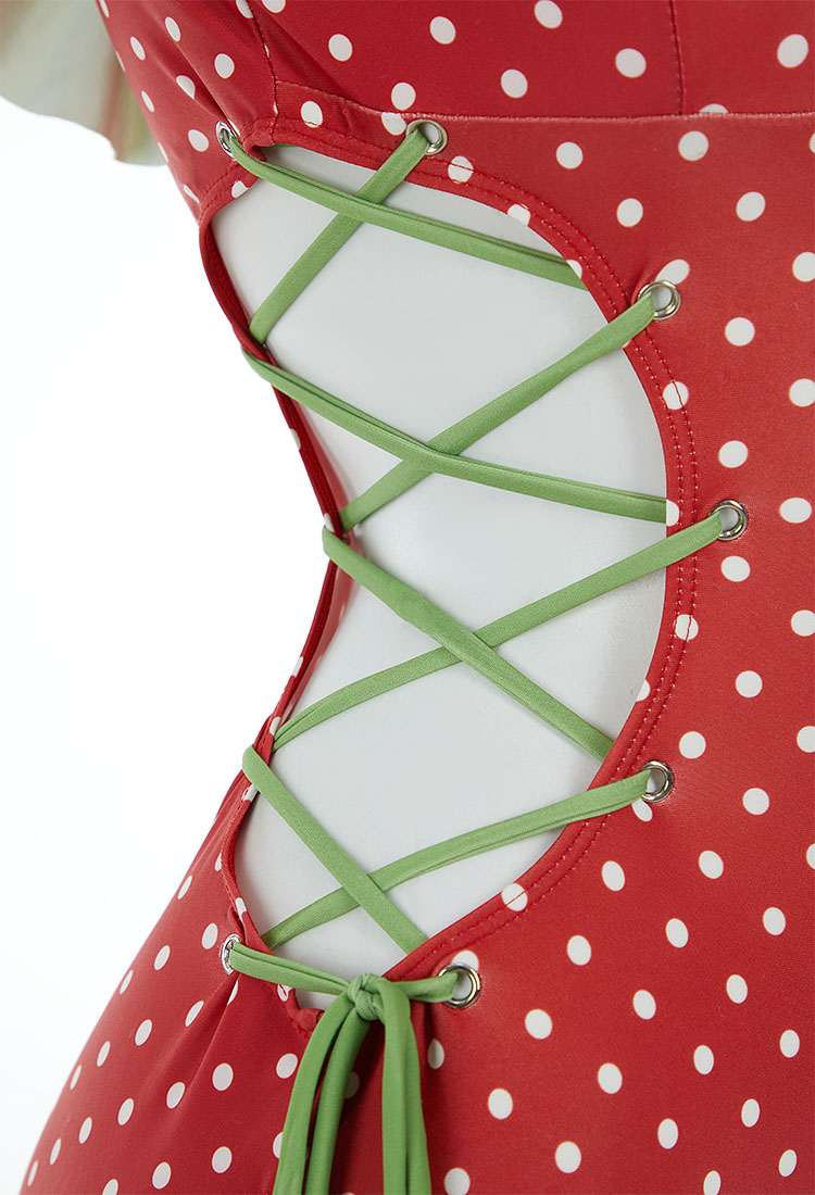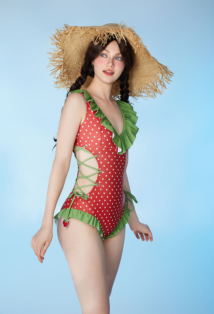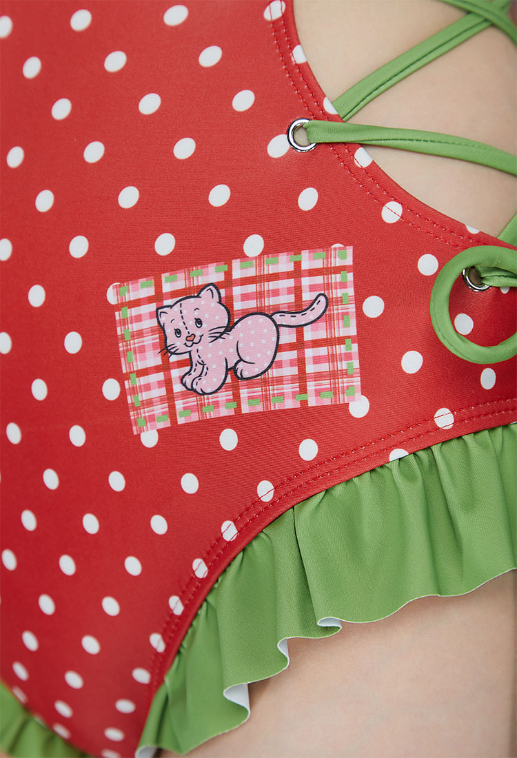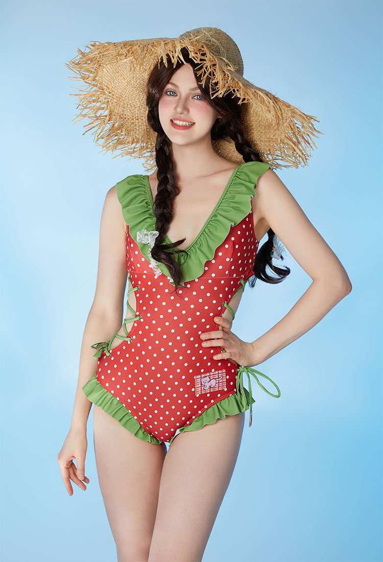 - Step into Strawberryland with this officially licensed Strawberry Shortcake Retro Strawberry Print Swimsuit. Designed to capture the charm of your favorite berry-loving heroine, this one-piece features vintage red and white polka dots paired with delicate green lace trim, creating a look that’s both playful and elegant.